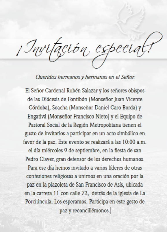 El año pasado, el Señor Arzobispo de Bogotá, el Gran Rabino Judío y el Sheikh Musulmán exhortaron de manera conjunta a todos sus fieles a orar por la paz. En tal sentido, colocamos en manos del Altísimo todas esas actividades y propuestas como un compromiso de fe, para que por la reconciliación lleguemos a la paz. Es por esto que se invita el hoy 9 de septiembre de 2015, a las 10:00 am a un acto interreligioso, ecuménico e interdenominacional a los líderes religiosos para orar por la paz y mostrar la solidaridad con las personas más necesitadas.  Este evento se realizará en el salón conjunto de la parroquia La Porciúncula en la dirección Cra 11 No. 72-82. Es abierto a todo el público que desee asistir.