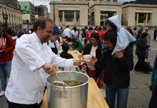 Varios chef colombianos entre ellos Harry Sasson, Eduardo Martínez y Leonor Espinosa se reunieron en la Plaza de Bolívar en el centro de Bogotá con el principal objetivo de brindar un plato de sancocho a todos los transeúntes que se acercaron al lugar.