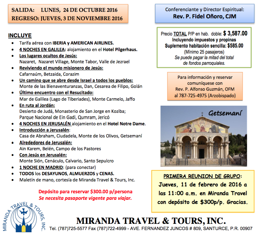 Los sacerdotes interesados en integrarse al grupo, procedentes de otro país fuera de Puerto Rico, por favor informarnos para coordinar el trayecto del viaje con la agencia de viajes.