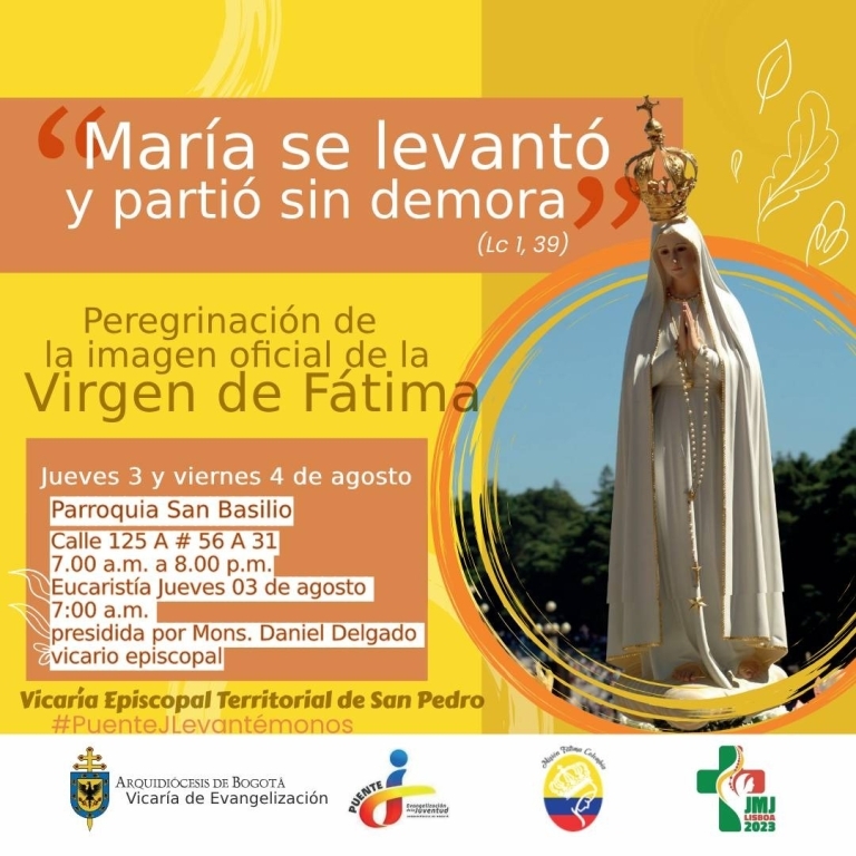 La imagen de la Virgen de Fátima traída del Santuario de Fátima estará peregrinando en la Parroquia San Basilio (Calle 125 A # 56 a 31) que es una de las Iglesias de nuestra Vicaría de San Pedro, jueves 3 y viernes 4 de agosto, templo abierto de 7:00 a.m. - 8:00 p.m.
