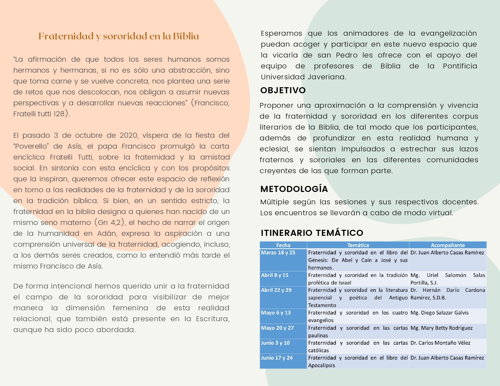 Retomando el programa de Bíblia "Más Evangelio para evangelizar" la coordinación de animación bíblica de la evangelización en la Vicaría abre las inscripciones para el curso "Fraternidad y sororidad en la Biblia" con la colaboración de docentes del área bíblica de la Pontificia Universidad Javeriana.