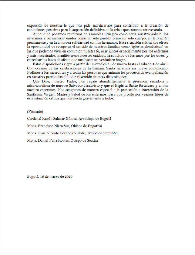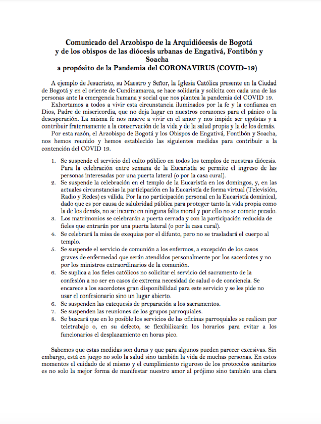Centro de información Yo quiero Noticias Boletines Eventos Artículos Canonización Mensajes del Señor Cardenal Cartas pastorales Homilías Mensajes La voz del pastor Documentos del Vaticano NoticiasSe suspende el servicio del culto público en todos los templos de Bogotá16 de Marzo de 2020Los obispos de las diócesis del territorio metropolitano de Bogotá (Engativá, Soacha y Fontibón) han dado a conocer un comunicado sobre la suspensión del culto público… Like 0 Dislike 0 Noticias relacionadas Nuestra fidelidad genera futuro ¡Feliz cumpleaños! Denunciemos